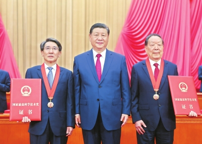 六月二十四日,全国科技大会、国家科学技术奖励大会和中国科学院第二十一次院士大会、中国工程院第十七次院士大会在北京人民大会堂隆重召开。中共中央总书记、国家主席、中央军委主席习近平向获得2023年度国家最高科学技术奖的武汉大学李德仁院士(右)和清华大学薛其坤院士(左)颁奖。