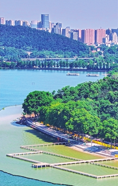 水是东湖的灵魂,也是东湖绿道“安身立命”之本。东湖风景区成立了湖泊保护与管理领导小组,编制出《东湖水环境综合治理规划》,全面禁止经营性汽油、柴油船舶在东湖水域通行,下决心搞起“排口”革命,采用“原位生态改底技术”“分步沉水植物群落构建技术”等多种技术,构建东湖水下良性生态系统,重现320万平方米“水下森林”,子湖相通、江湖相济的大东湖生态蓝网和山体相连、山峦相映的大东湖生态绿网正稳步编织。
