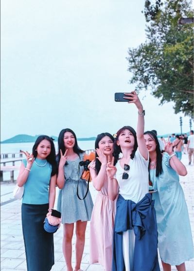 那天,我和好友迫不及待地来到凌波门,拿出拍摄设备赶紧记录眼前的美景和一个个开怀大笑的难忘瞬间。我还特意拿出毕业熊和花束,在凌波门前回眸、展臂、比“耶”,好不快乐!