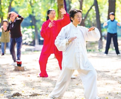 常青花园居民正在打太极。