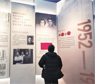 1949年底,在美国留学的武汉学子朱光亚牵头组织起草了《给留美同学的一封公开信》,号召大家回到祖国,引起热烈反响。2个月后,他拒绝了优越的工作条件和物质生活,同51名留学生一起回归祖国……展览现场,观众可以翻阅朱光亚公开信的复印件,并从老式录音机中聆听他号召学子报效祖国的呼唤,感受朱光亚的赤子之心和家国情怀。
