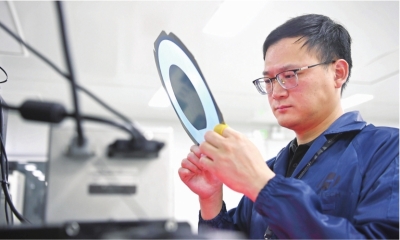 华工激光半导体产品线总监黄伟在实验室检查硅晶圆。