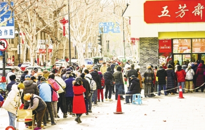 市民排着长队购买五芳斋汤圆。