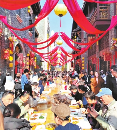 市民和游客在春晚武汉分会场取景地汉口里长桌宴就餐。