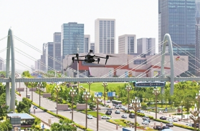 普宙科技研发的无人机飞在空轨上空巡检。