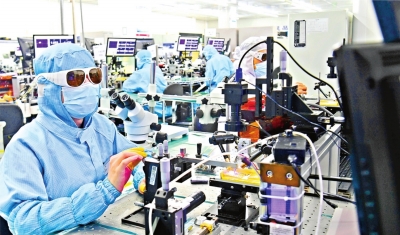 武汉锐科光纤激光技术股份有限公司生产车间,工作人员在精心操作仪器设备抓紧生产。