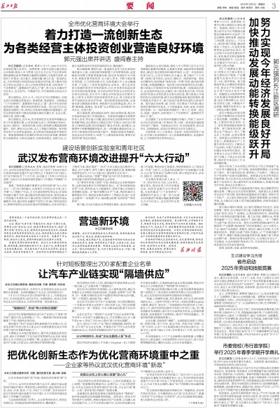 3月5日召开的全市优化营商环境大会上,市委依法治市办、市市场监管局、武汉经开区、东湖高新区、武昌区负责同志先后作交流发言,分享如何营造一流发展生态。
