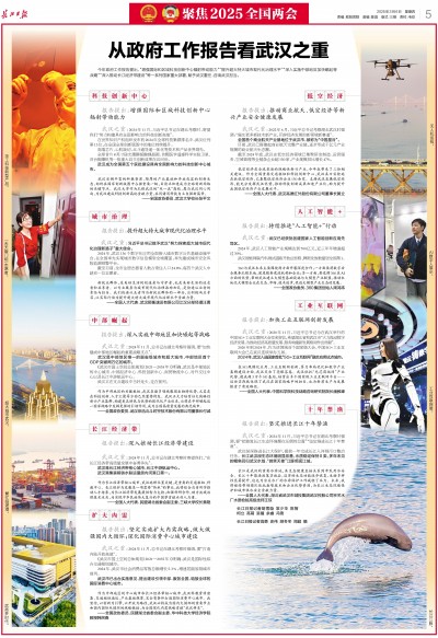 今年政府工作报告提出,“增强国际和区域科技创新中心辐射带动能力”“提升超大特大城市现代化治理水平”“深入实施中部地区加快崛起等战略”“深入推动长江经济带建设”等一系列国家重大部署,赋予武汉重任,召唤武汉担当。