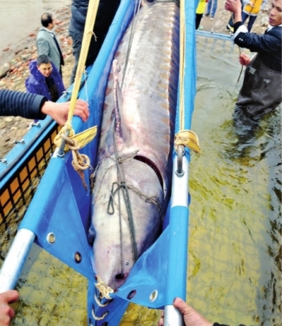 2014年11月15日,武汉新洲渔民张锦在沐鹅洲江面上误捕一条中华鲟:体长2.95米,体重310公斤,年龄15—20岁,是近20年在长江水域发现的最大个体野生中华鲟,也是近20年来发现的最大的怀孕中华鲟