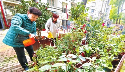长江日报讯(记者邓小龙)3月10日上午11时许,住在武汉市江汉区汉兴街道常青二垸小区74栋2单元一楼的阮金成走出家门,给小区“花园客厅”的花箱浇了一些水,并整理了一下枝叶。
