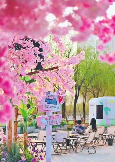 文旅集团用樱花装饰扮靓桥墩电影院。