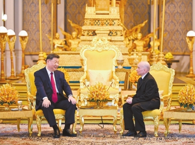 4月17日下午,柬埔寨国王西哈莫尼同中国国家主席习近平在金边王宫举行会见。