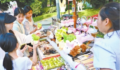 游客在东湖文化市集摊位前挑选文创产品。