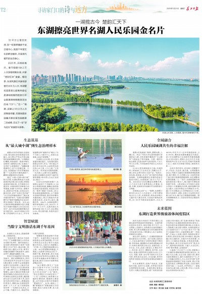 通过“大湖+名湖+城中湖”综合治理,东湖统筹推进大东湖流域系统治理、综合治理,持续推进流域河湖长制、水环境综合治理攻坚、幸福河湖共同缔造行动等措施,构建“水岸同治、湖塘并治、流域共治”机制,水质创40年最优纪录,获评“全国示范河湖”“长江经济带最美湖泊”“湖北省幸福河湖”称号。“东湖示范河湖智慧平台”荣获中国测绘学会2024年度优秀测绘工程金奖。全长105公里的环湖绿道被联合国人居署列为“改善中国城市公共空间示范项目”,成为市民游客静享慢生活的诗意空间。2022年《湿地公约》第十四届缔约方大会上,中外专家盛赞这种“城湖共生”模式:“在千万级人口城市中心,保留生态湿地,这是中国智慧。”