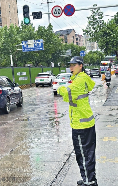 上午8时许,硚口交通大队汉警快骑队员“00后”的朱蔓菁迎着暴风雨,坚守在古田四路道路施工路段,指引行人车辆绕过积水洼地,保障道路安全畅通。