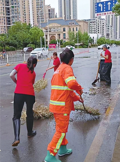 上午趁雨暂停,环卫人员及时清理垃圾。