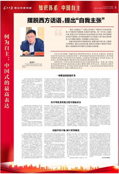 破,是破除西方话语霸权。为什么我们有理说不出、说了传不开?一个不可忽视的原因是,长期以来,中国学术、理论、话语表现为对西方学术、理论、话语的“学徒状态”,即陷入西方中心主义话语体系中,用西方话语解读中国道路,用西方理论裁剪中国现实。而在西方话语和西方叙事框架下,是不可能真正揭示“中国道理”的。构建中国话语和中国叙事体系,一项紧迫的思想任务就是摆脱西方理论、西方话语、西方叙事,提出真正的“自我主张”。西方一些理论观点和学术成果可以用来说明其自身发展历程,在一定地域和历史文化中具有合理性,但如果硬要把它们套在中国头上,甚至以此为裁判,那就是荒谬的了。“理论上的搬运工”“话语上的学徒工”是缺乏文化自信的表现,不可能讲好中国故事、传递好中国声音。唯一可行的、正确的大道,就是立足中华民族伟大历史实践和当代实践,用中国道理总结好中国经验,把中国经验提升为中国理论,既不盲从各种教条,也不照搬外国理论,实现精神上的独立自主。