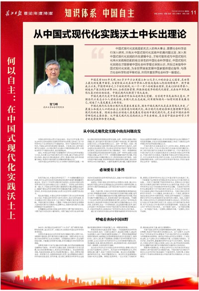 需要再次强调的是,中国社会科学自主知识体系的形成必须要深入到中国式现代化实践的内部。中国式现代化实践为中国自主社会科学知识体系提供了丰富的营养,当前时期,中国社会科学工作者的光荣使命是从中国式现代化实践的沃土中长出理论。