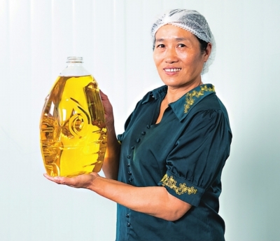 “小丫姐”刘翠娥和刚刚榨出来的菜籽油。
