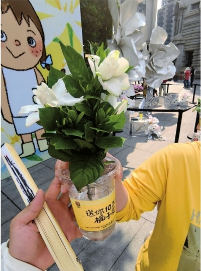 不得不说,这种活动方式真不错。几朵栀子花被扎成一小束,放在一个塑料杯中,杯子上配有活动图案,显得非常“夏天”。拿到手后,花香扑面而来。
