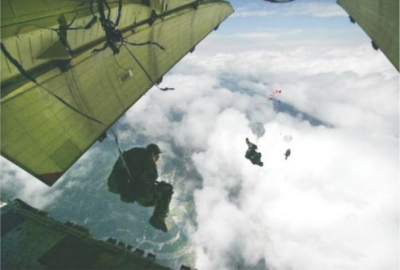 2008年5月14日,“空降兵十五勇士”在汶川地震重灾区茂县崇山峻岭上空实施空降。