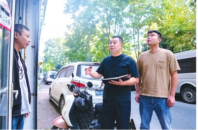 朱博(中)和同事(右)走访中向群众了解情况。