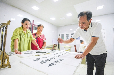 7月2日,汉阳区五里墩街道五福里社区纳凉点内凉风拂面。在棋牌区,孩子们聚精会神地在棋盘间展开无声的智慧较量。书画桌前,书法爱好者挥毫泼墨,墨香伴着笑语静静地飘散。会议桌上,居民认真地跟着社工学习制作艾草棒。社区网格员为居民倒上花红茶、切好西瓜,全程值守,保障居民安心纳凉。图为书法爱好者正在写毛笔字。