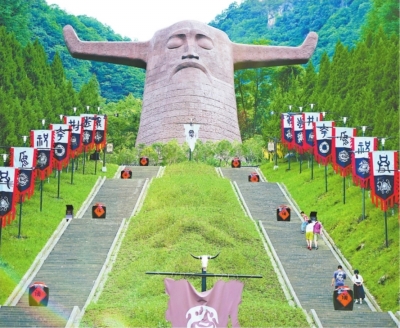 走进神农坛景区,最为震撼的就是牛首人身的神农雕像,高大雄伟、庄严肃穆,其双目微闭,似在洞察世间万物。据介绍,塑像以大地为身躯,身像高21米,宽35米,高宽加起来56米,象征56个民族的大团结。