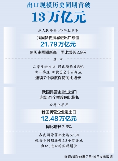 新华社北京7月14日电(记者张晓洁 邹多为)海关总署14日发布数据显示,以人民币计,今年上半年,我国货物贸易进出口总值21.79万亿元,创历史同期新高,同比增长2.9%。其中,二季度进出口同比增长4.5%,比一季度加快3.2个百分点,连续7个季度保持同比增长。
