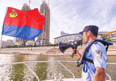 巡逻艇上的水警正拿着扩音器,朝江中游泳的人们喊话提醒。