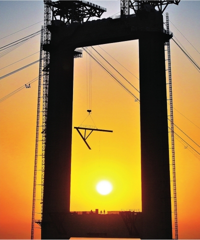 中交二航局双柳长江大桥项目部总工程师陈诚介绍,为大桥主塔施工研发的一体化智能筑塔机,降低了施工中的噪声和扬尘;为避开水生动物活动高峰期,工地选择“错峰施工”。