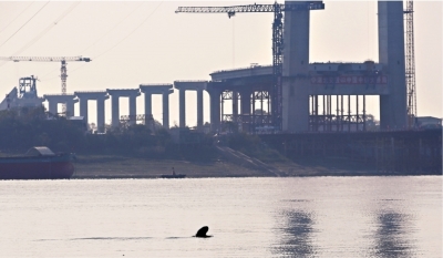 2024年11月21日,一头长江江豚正在在建的双柳长江大桥附近迎浪捕食。