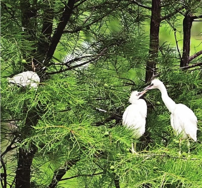2025年6月12日,涨渡湖湿地公园,两只幼鹭在巢中等待食物。