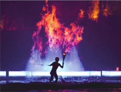 在万众期待下,世运圣火在湖中点燃,以水火相生的科技创新美学,向全世界传递梦想之光。