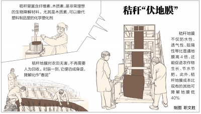华中农业大学团队发挥奇思妙想,对另一种同样难以处理的农作物秸秆施以“魔法”,让它变成可生物降解的环保“伏地膜”,一石二鸟解决了两种困扰农业生产和生态环境的大难题。秸秆地膜的成本很低,比目前市场上的其他生物降解地膜便宜近一半。