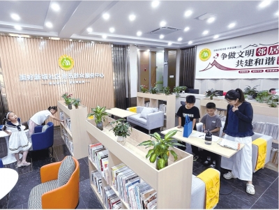 孩子们在亲民化改造后的美好新城社区党员群众服务中心内看书、自习。