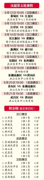从分组及赛程上看,拥有6支球队的汉口赛区在汉超第一阶段赛事中完成度最为齐整。目前所有球队均已战罢4轮。其中江岸区代表队4战4胜进18球失1球,积12分占据汉口赛区榜首。