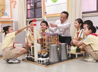 江岸区鄱阳街小学党总支书记严涛和学生们观看省电力博物馆电力文化展。