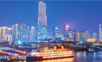 夜幕时分,位于汉口江滩的游轮“知音号”灯光璀璨。
