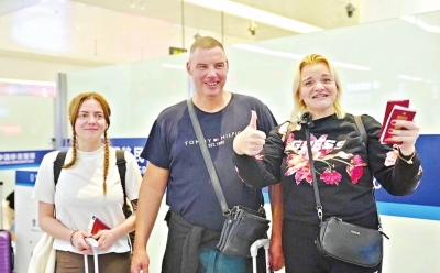 与丈夫(中)、女儿一起来中国度假的俄罗斯游客格尔曼女士(右)向武汉边检站民警竖起大拇指,点赞中国对俄免签政策。