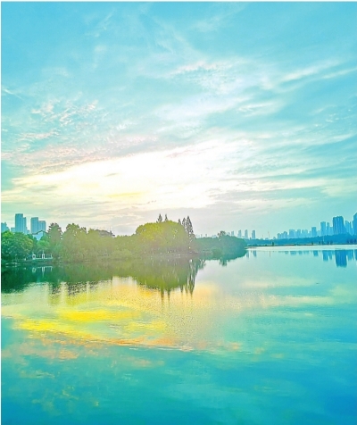 墨水湖如同透亮的蓝色玻璃,天上的云、岸边的树和远处的高楼倒映水中,好一幅治愈心灵的画面。