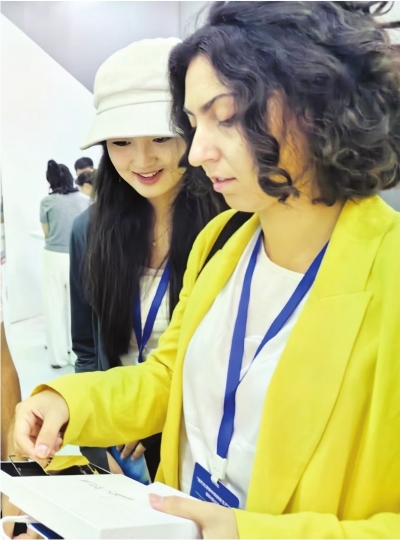 北京大学意大利访问学者阿里安娜查看激光打印出来的带有自己手写体姓名的书签。