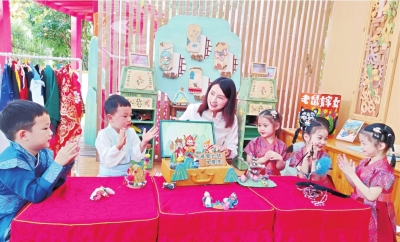 邀请小学生来演课本剧,借助小学的资源帮孩子启蒙。我们打破了幼儿园单方面向小学学的习惯,邀请毕业的孩子回来,演《花为媒》里的《报花名》,手把手教弟弟妹妹做《卖水裱花》的手势动作。戏曲选段让传统文化慢慢融入孩子的审美,各种学科的课本剧也让孩子向往小学的期待变得具体又实在。