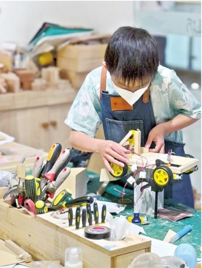 备赛期间,汪子轩练习制作小车。