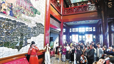 主楼中的《黄鹤楼中吹玉笛》表演吸引众多游客驻足观看。