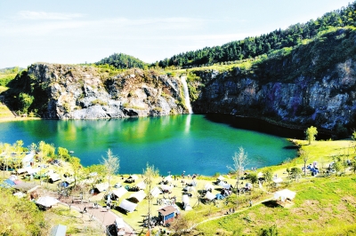 如今,原来的大矿坑引来流水被打造成人工湖,矿坑里的矿物元素让湖面呈碧蓝色,湖水像一块宝石嵌在矿山之中,约50米高的瀑布从山顶飞泻而下,在湖面激起层层水花。徒步登上园区的高山草甸,一片面积200多亩的草地如同一张绿色的毛绒地毯,令人流连忘返。