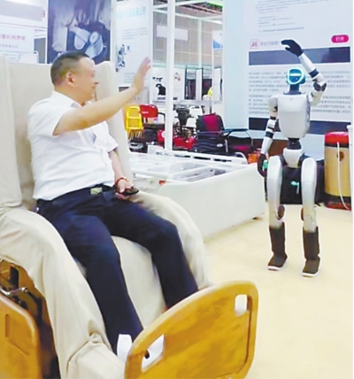 邓恩黎的父亲坐在“床变轮椅”上,和机器人打招呼。