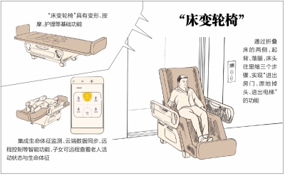 研发这种“床变轮椅”完全出于我照顾家里老人的经历。那时,家里老人已行动不便,我们照料时使用手摇床护理,大家都很疲惫,还照顾得不好。我就想到做市场调研,看有没有一种产品,能让照料老人的子女护理省心省力,老人自己也感到舒适、方便些。在这个过程中,我看到过床与轮椅的对接技术,但解决不了看护问题,便萌生了“床变轮椅”的设想。
