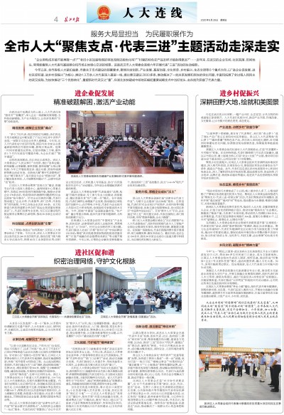 从企业车间的“纾困解难”到社区院落的“民生答卷”,从田间地头的“致富经”到乡村振兴的“新图景”,全市各级人大代表用脚步丈量民情,用实干诠释担当。六年深耕,初心如磐。武汉人大“代表三进”活动已成为践行全过程人民民主的重要载体和生动实践,让人民群众深切感受到全过程人民民主就在身边。