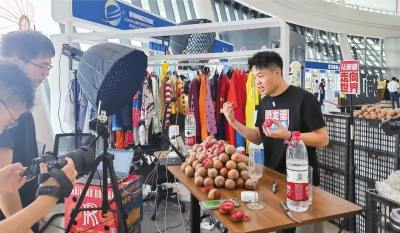 在花湖机场附近的鄂州跨境电商产业园直播间,主播正在售卖新疆水果。